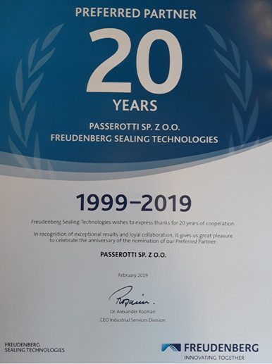 Firma Passerotti jest dystrybutorem produktów Freudenberg (głównie oryginalne Simmerringi oraz uszczelnienia do hydrauliki) z najdłuższym doświadczeniem w Polsce. Współpraca została nawiązana w roku 1999 i trwa do dziś – 20 lat. Passerotti sp. z o.o. ma jako jedyna w Polsce status Preferowanego Dystrybutora (Preferred Distributor).