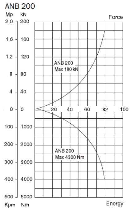 Na osi X przedstawione jest ugięcie zderzaka (w mm), a na osi Y siła (część górna) oraz energia potencjalna sprężystości (część dolna). Dopuszcza się ugięcie zderzaka do ok. 50% wysokości w stanie nieobciążonym. ANB200 ma wysokość 160 mm, stąd maksymalne ugięcie na wykresie 82 mm.